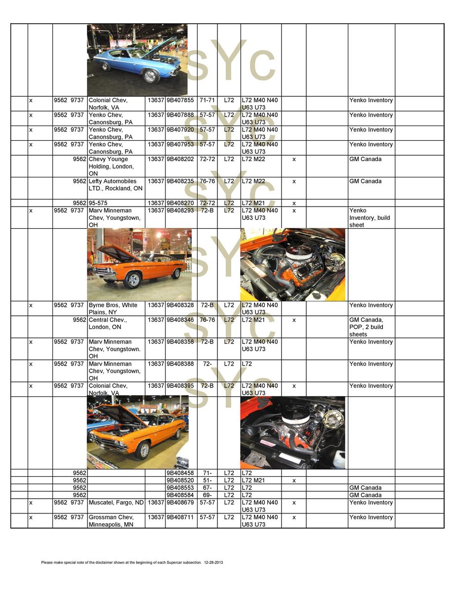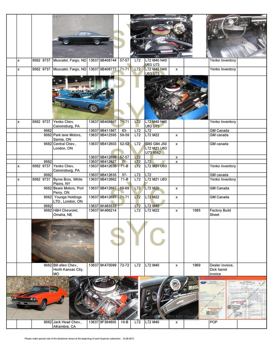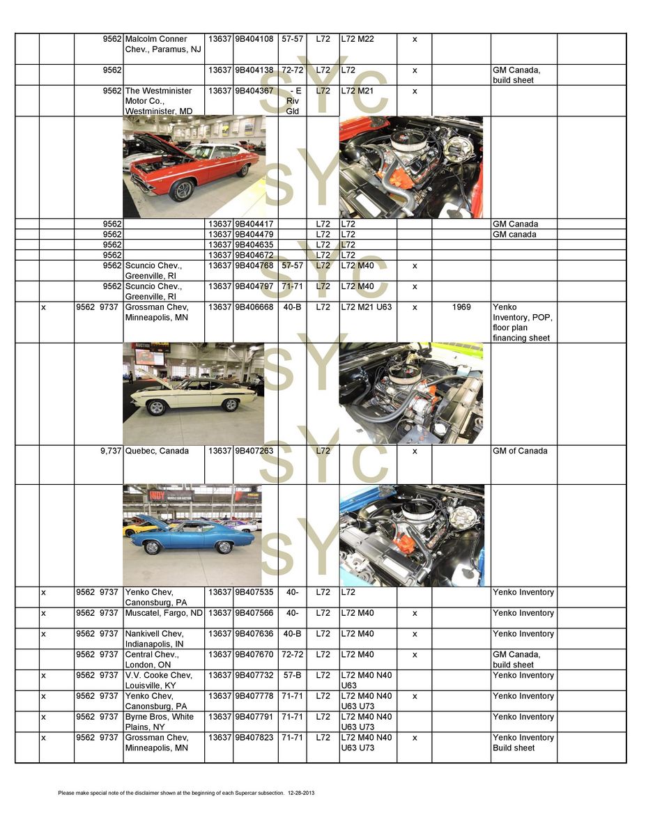 Chevelle sport coupe, four-speed manual, Positraction. Must be used with COPO 9694 disc brake option. 9562BA Chevelle sport coupe, TH400 automatic and Positraction. Must be used with COPO 9694 disc brake option. 9562CD Chevelle sport coupe, four-speed manual, Positraction, bucket seats, 15-inch tires, special coil springs. 9562CE Chevelle sport coupe, four-speed manual, Positraction, 15-inch tires, special coil springs. 9562DD Chevelle sport coupe, TH400 automatic, Positraction, bucket seats, 15-inch tires, special coil springs. 9562DE Chevelle sport coupe, TH400 automatic, Positraction, 15-inch tires, special coil springs. 9562EA Chevelle sport coupe, four-speed manual, Positraction, J52 power disc brakes, F70x14 tires. 9562FA Chevelle sport coupe, TH400 automatic, Positraction, J52 power disc brakes, F70x14 tires. 9694CA Four-speed manual, Positraction, special front disc brakes, J50 power brakes, COPO 9737 equipment. 9694CB As above, but with TH400 automatic. 9566AA Four-speed manual, Positraction, J52 power brakes, Super Sport wheels. 9566BA As above with TH400 automatic, 15-inch F70 raised white letter (RWL) tires on Rally wheels, Speedometer Reducer Gear. |