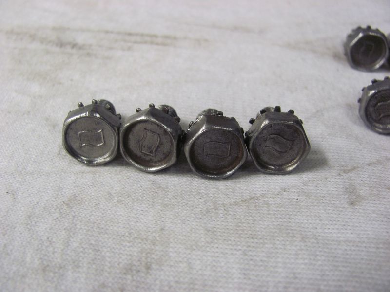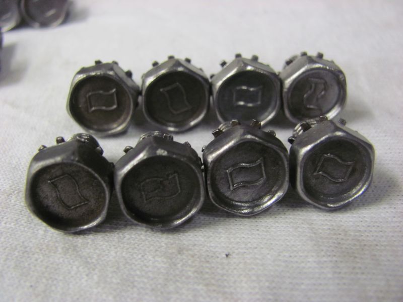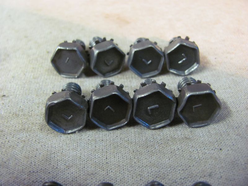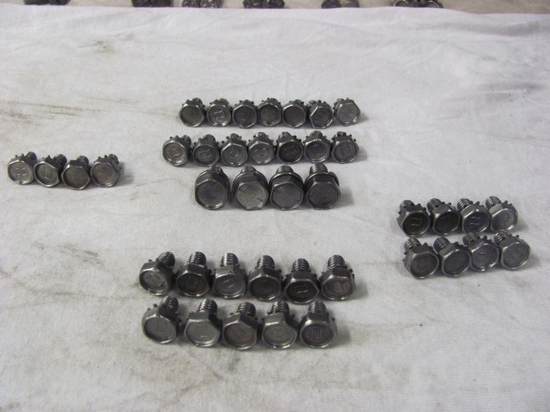This set is for the LARGE Flag design. 11 Timing chain cover bolts (Flag) 14 oil pan side rail bolts (Flag) 8 water pump backing plate bolts (Flag) 4 inspection cover bolts (Flag) 4 oil pan corner bolts (ELH) THESE HAVE ALL BEEN CLEANED AND ARE READY TO INSTALL ALL WASHERS-STAR AND LOCK SPIN FREELY ITS VERY HARD TO FIND NICE CLEAN COMPLETE SETS 100.00 (2 sets available) |