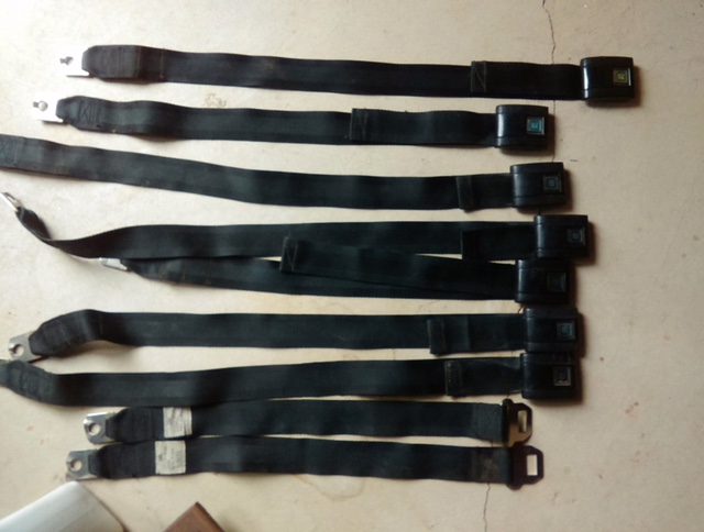 70 standard black seat belts in nice shape all have good color and buckels 7 with buckels and2 with male ends $285 been trying to load pictures don't know how to make smaller