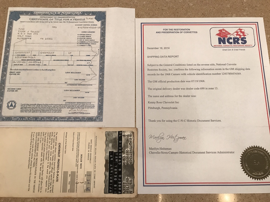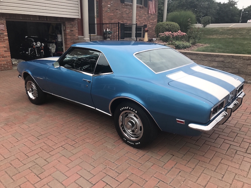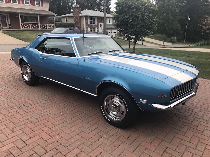 Lemans Blue/White Stripe - Deluxe Interior Born with - drivetrain and all components, wheels and seats, belts and dash. MO motor, M21 and BV Axle Factory Protect-o-plate, sale history paperwork from 1984, last inspection sticker from 1973. MacNeish inspection report done in December, 2014. Virtually perfect inspection. This car has been in Aliquippa, Pa its entire life with all two owners and the selling dealership (Kenny Ross) within 5 miles of each other. The original owner (Angelo Casuccio) parked the car in a building in 1972 where it sat all intact until 1984 when it was time to raze the building. A local gas station towed it out and got the car for towing/storage fee's. The second owner (Teddy)*then purchased the car with its mileage at 34,740 and where it is still is today. In 2007 Teddy had Chuck Huber and Paul Cupp from CPRx do a comprehensive no expense spared restoration on the car using only vintage - NOS GM parts where needed. All parts were acquired*in the mid eighties thru Miller and Sons Chevrolet, Aliquippa PA. As noted in the inspection/certification report - the Le Mans blue and white stripes are excellent, the original Deluxe seats. console, and gauges are excellent w/ restored original door panels. Engine bay is in excellent condition. Under Carriage is in excellent condition w/original floors and trunk. This Z28 is restored to the highest level and qualifies to enter the "Legends Concourse Certification". As you would expect, show chrome, re-anodized aluminum, perfect body fit and trim alignment. Very crisp, clean lines and detail. The pictures sell the car - if you ever have seen my Yenko cars, this is right with it. This car has in Muscle Car Review - September 2010, MCACN 2016 and as far as storage goes - it lives in a bubble all the time. Fresh as the day it was done. The level of detail put into this 68 RS/Z28 is second to none. $110,000.00 Impossible to acquire a documented, born with drivetrain RS Z/28 and then restore it at this quality for this money. Feel free to contact me….. Eddie PM’s or call, 480-208-8259 cell AZ