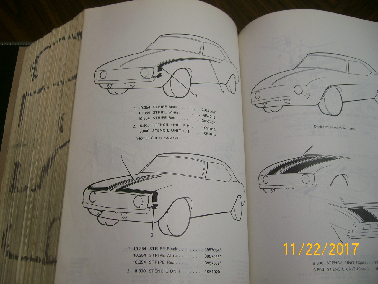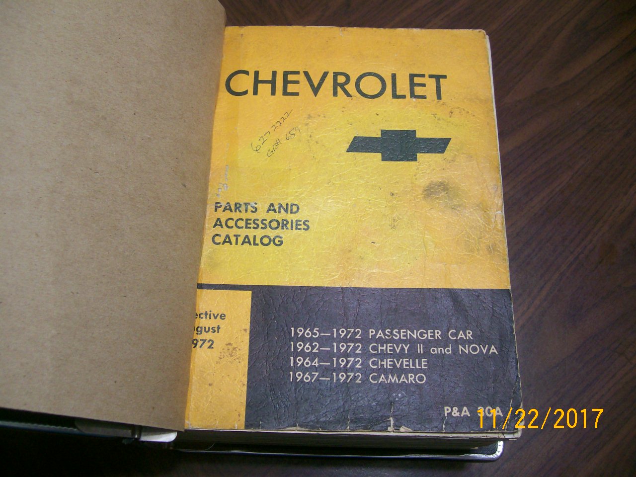 I have a used 65-72 Passenger car, 62-72 Chevy II & Nova, 64-72 Chevelle, and 67-72 Camaro parts and illustration catalog with an effective date of 8/72 in good used condition. This is a text and illustration catalog all in one. This book is over 4" thick and is in a very nice newer GM Parts binder. The price is $275.00 plus shipping.
