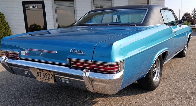 This is absolutely a beautiful car. Georgia rust free and in exec. condition. This car is loaded with rare and great options. 77,000 miles on the body. This is a true matching numbers factory 396/325 h.p. Automatic Caprice . Marina Blue exterior. Black vinyl top. Blue Interior. Bucket seats and floor shifted console. Console full gauge pkg. Console rear passenger courtesy light at the back of the console. AM FM stereo. Passenger Under dash swing out tissue dispenser. A/C blows cold and is still R12. Tinted glass. Power steering and brakes. 427 heavy Duty coil springs. The underside and frame have been all detailed and painted. All new suspension and brakes.Much time and $$$$$ money spent to make this car beautiful and reliable. Drivetrain was gone thru and stock specs. One size larger camshaft not radical at all. Cruises and drives exec. These are hard to find like this. All new inside and out a few years ago. No expense or parts were spared. All GM parts no reproduction at all. 15" American Racing Torque Thrust D's. . Dual exhaust with Three Chamber Flow masters. Not loud at all sounds great. All works exec. $34,900. Car is Located in Livonia, Michigan.