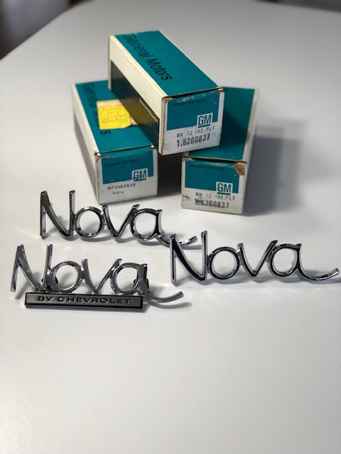 1) 1969-72 NOVA FRONT FENDER AND REAR TRUNK LID EMBLEMS GM #6260837 PAIR $175 GM #3953676 $100 NOS NEVER INSTALLED STILL IN ORIG GM BOXES 3 PCS TOTAL 2) 1970-72 NOVA FRONT FENDER 396 L78 EMBLEMS NOS NEVER INSTALLED STILL IN ORIG BOXES $175 FOR PR 3) 1970-73 NOVA FRONT & REAR MARKER LIGHT BEZELS NOS NEVER INSTALLED STILL IN THE BOXES GM #3962933 $250 SET OF 4 PCS FOR THAT CONCOURS/ FRAME OFF RESTORATION/ PREMIUM SHOW CAR WHERE ONLY REAL GM PARTS ARE A MUST shipping additional please contact me via pm or e-mail [email protected] thx chris