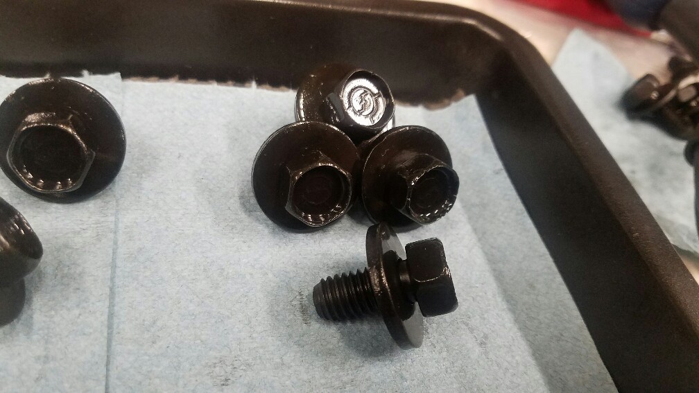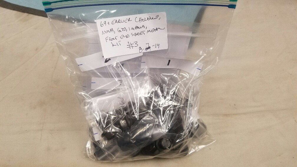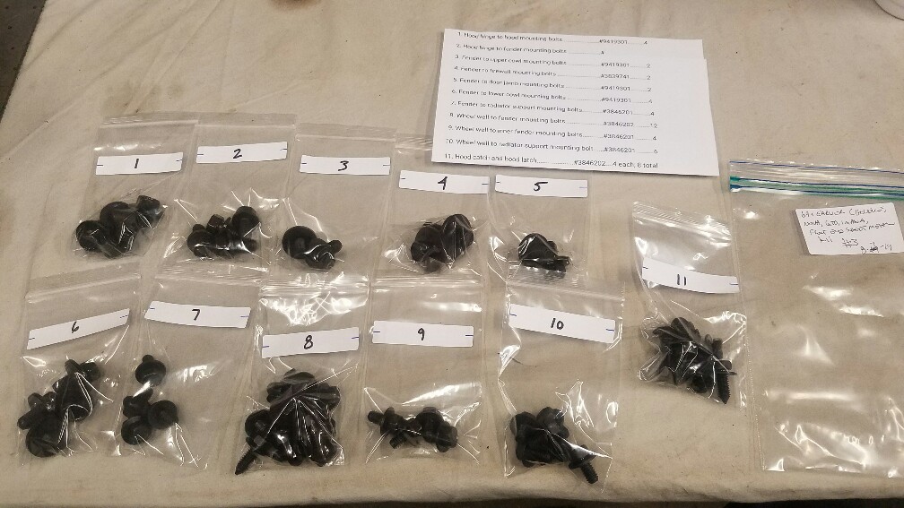 Kit 2 1. Hood hinge to hood bolts F (4) 9419301 2. hood hinge to fender bolts F (4) 3. Fender to upper cowl bolts F (2) 9419301 4. Fender to firewall bolts F (2) 3839741 5. Fender to door jamb bolts F (2) 9419301 6. Fender to lower Cowl bolts F (4) 9419301 7. Fender to radiator support bolts RBW (4) 3846201 8. Wheel well to fender bolt RBW (12) 3846202 9. Wheel well to inner fender bolts E (4) 3846201 10. Wheel well to radiator support bolts E (6) 3846201 11. Hood catch and latch bolts RBW (8) 3846202 $310 shipped to the lower 48 ppff |
