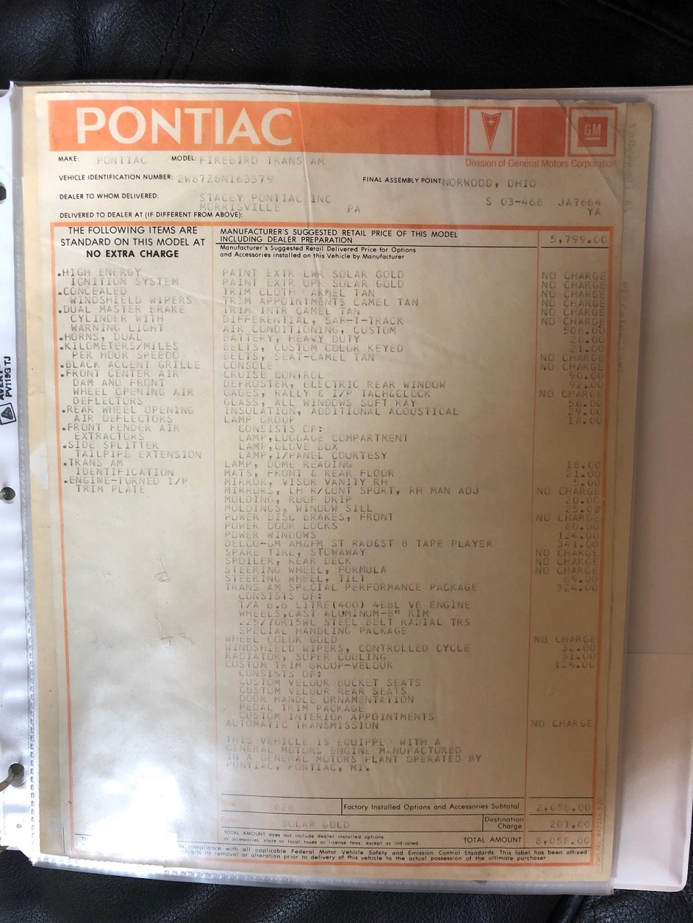 78 Solar Gold 17,000 mile Survivor. Original paint and impeccable original interior. This was a 1 owner car until 2017. It was taken off the road in 1984 and stored in a climate controlled garage. Zero rust . Heavily documented with its original MSRP, bill of sale, Owner’s manual, etc. There are lots of Trans Ams out there... not many original examples like this. $44,900. Interesting trades considered.