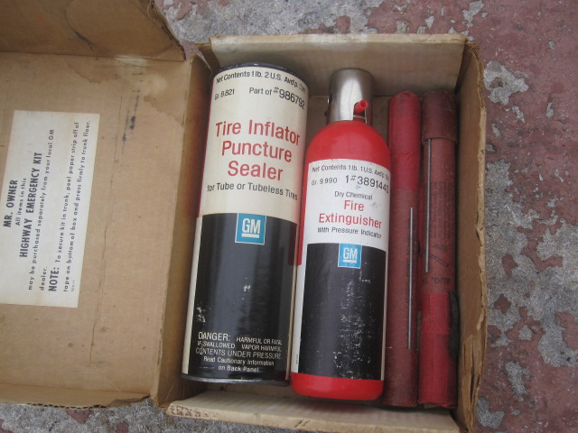 Selling GM Highway emergency Kit part number 986792. The box is worn, torn, and stained. The containers are full. There is two flares and a orange plastic flag also in the box. Price is 320 paypal ff shipped lower 48 USA. Larry 5203492337.