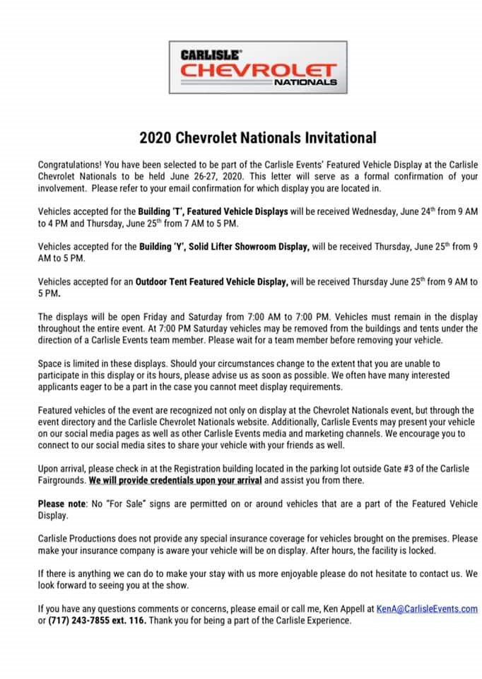 We got this awesome invitation yesterday to be apart of the Carlisle Chevrolet Nationals with dads 71 Monte Carlo. We will be part of the indoor display celebrating 50th anniversary of the Monte Carlo. The head of the Michigan Monte Carlo Club saw our car at THE Detroit Autorama and reached out to the folks at Carlisle Events and told them about our car. They emailed us for some more information and pictures and within a few minutes we got this formal invitation to be a part of their event! So we will be heading to PA this June to be a part of this event!