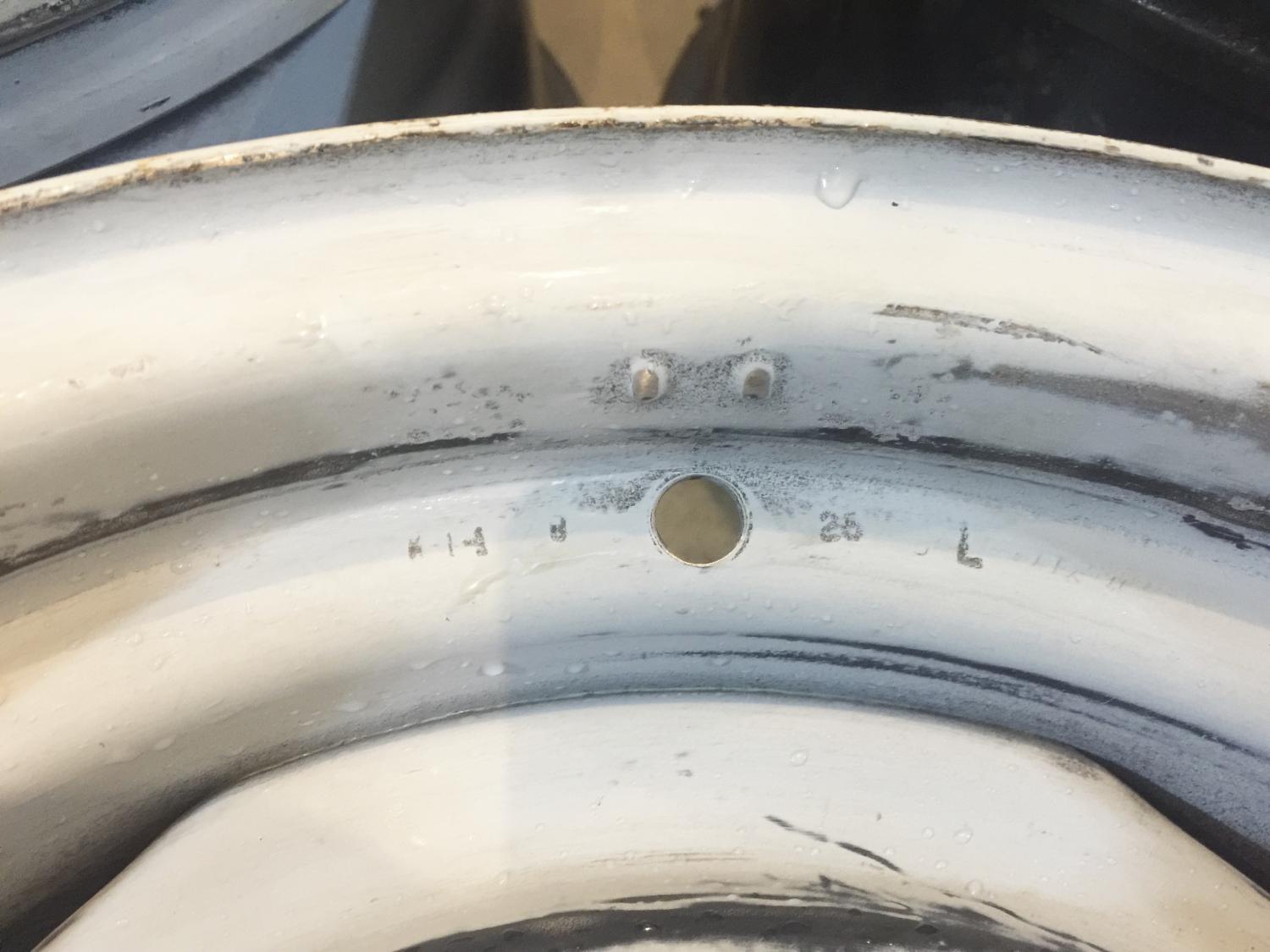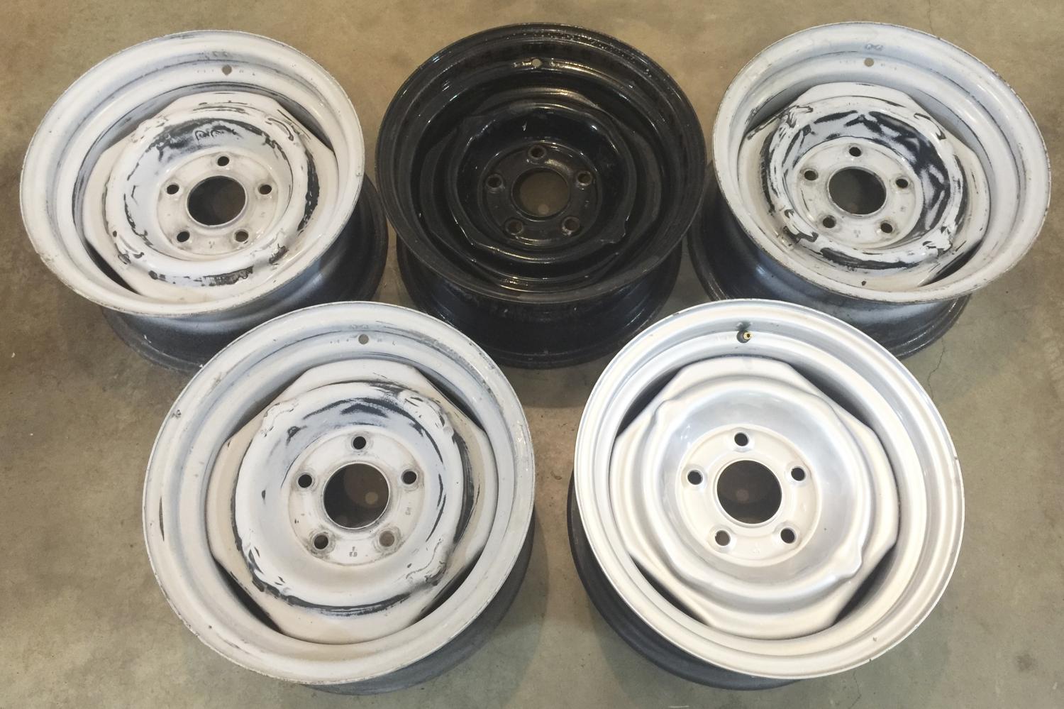 This is a very good date-matched set of 5 wheels that are correct for 1970-1972 Camaro SS and 1971-1972 Nova SS not optioned with Rally style wheels. Date codes are 1971, with 4 wheels manufactured 8/25 and 1 wheel manufactured 8/26/71. I believe these are also correct for Firebirds of the same era that were fitted with 14x7 wheels but not optioned with Rally II's or Honeycombs. As you can see, one wheel is in the original black finish, 3 are primed and sanded for repaint, and one was finish painted before the project went a different direction. SOLD 12/20.