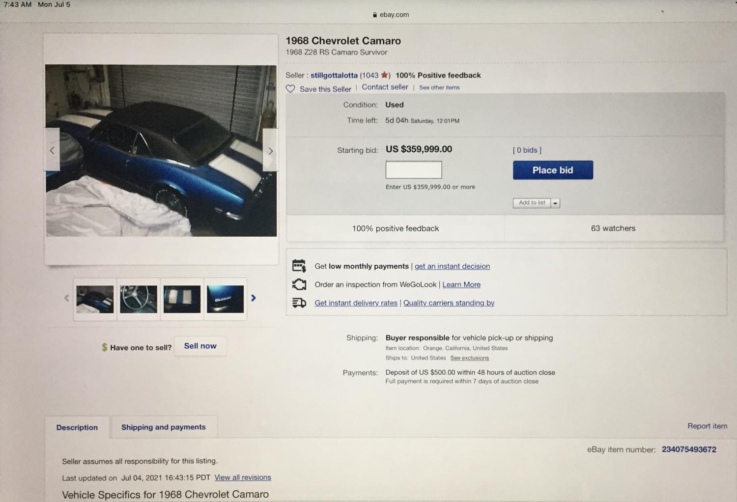 Sweet car - blue on black on blue RS with docs. These days, the opening bid of $70k doesn't seem as crazy as it would have seemed a year ago. Being a CA car, the paint may actually clean up fairly well.