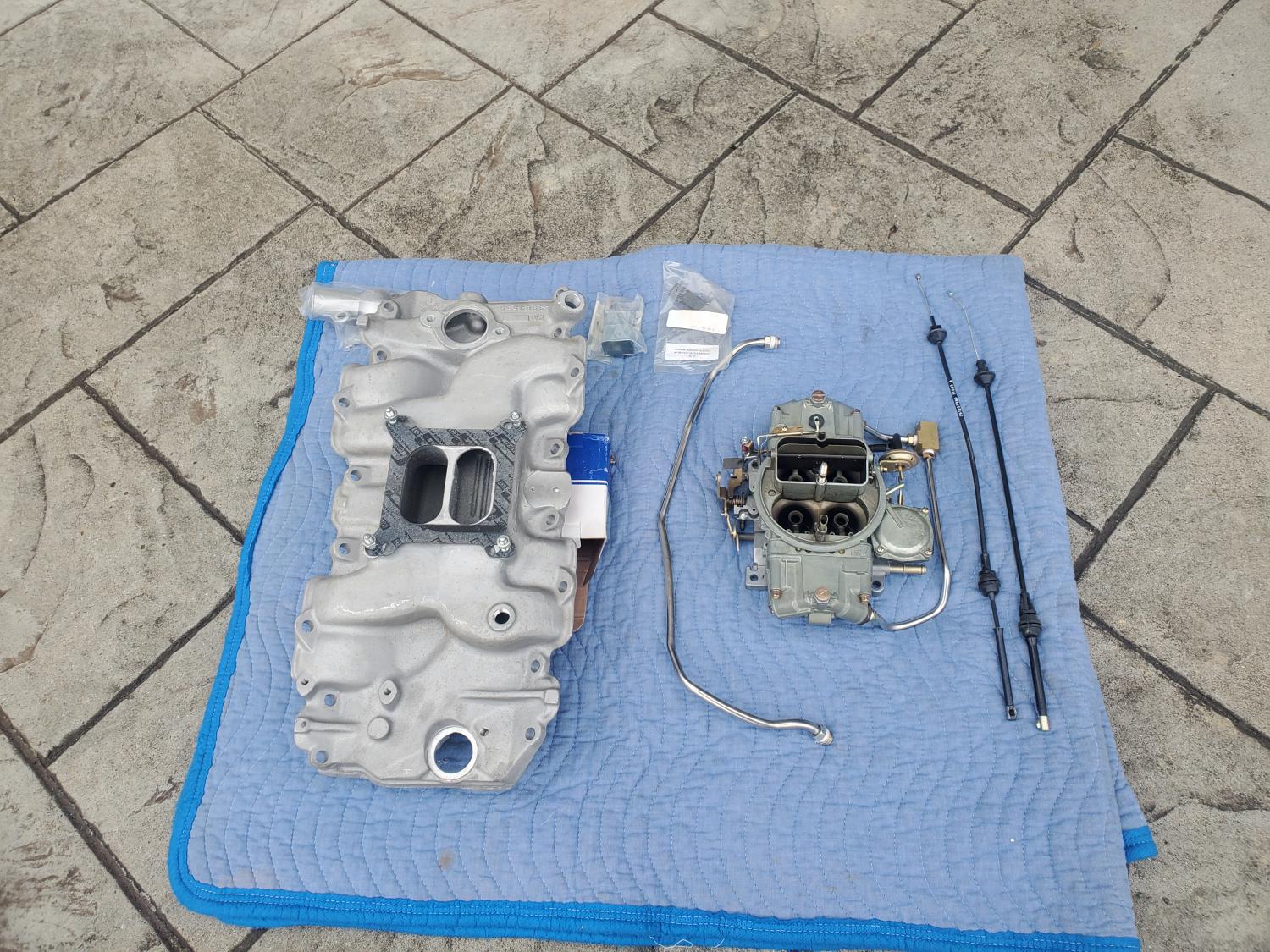 1970 new top half including #4557 holley carburetor with gasket and the #3963569 low profile aluminum intake with #660 thermostat and gasket. Set also includes the fuel lines with the block and throttle cables. This set came from the parts place and sells for $1795 new. These parts have never been used $1450