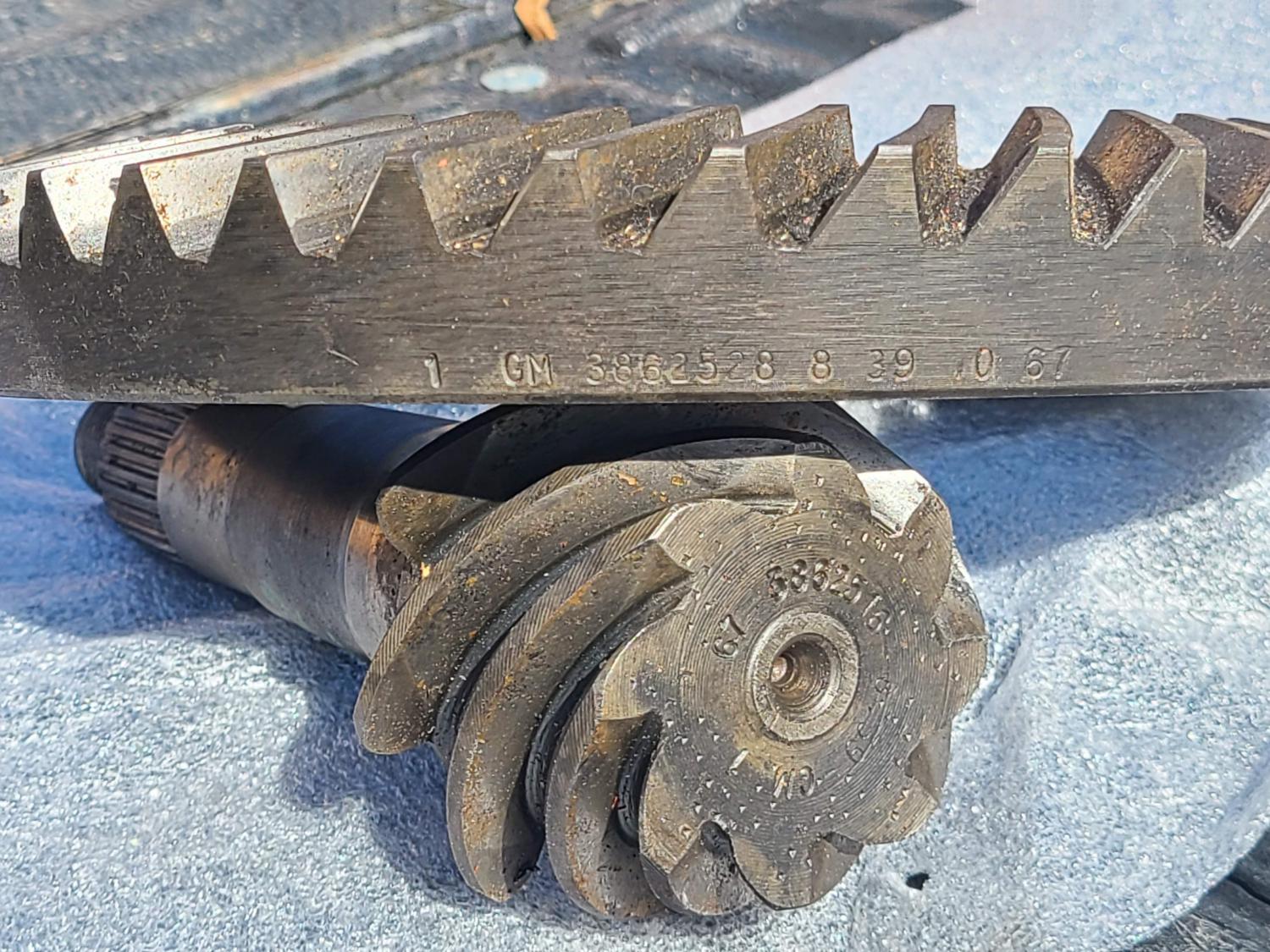 This is an original GM 4.88 12 bolt ring and pinion. Ring is stamped 3862528, pinion 3862516. These were removed from the same car. The date ring is dated October 1967, pinion January 1967. There is a small chip on one corner of the pinion teeth which will not impact function (pictured). Dated original GM gears are getting increasingly difficult to come by, especially for the 4.88 ratio.