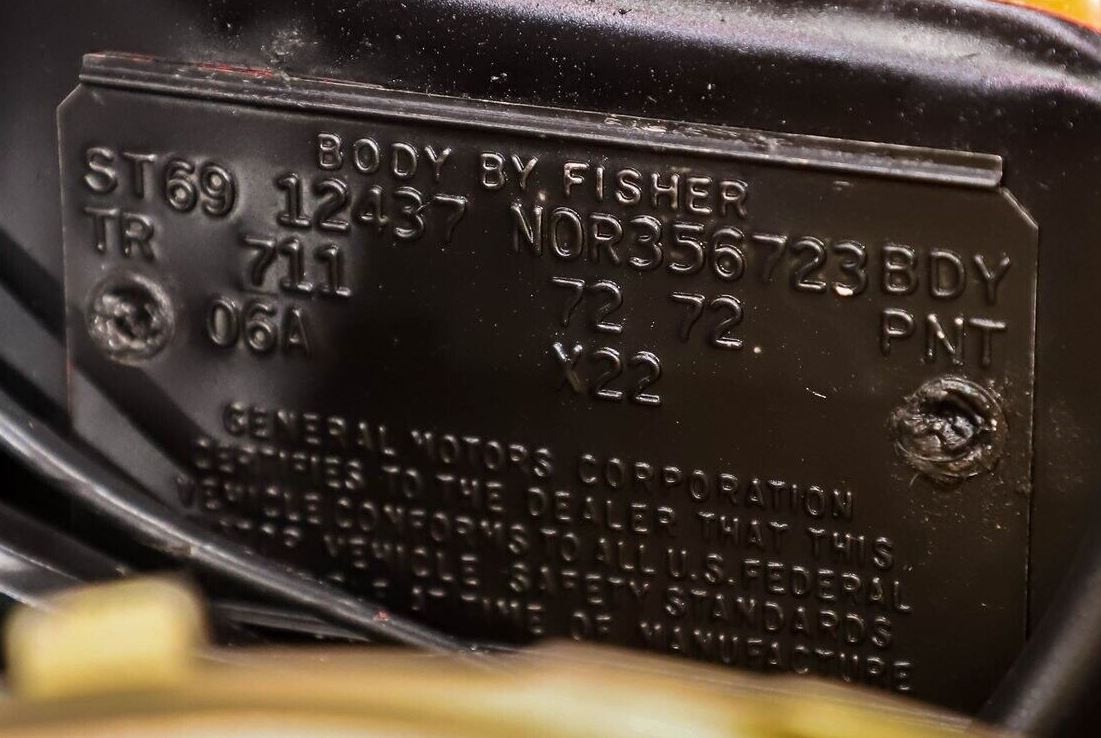 123379N660459 From the ad: "Body off frame, nut and bolt restoration. Factory correct L89 396-375 hp with aluminum heads. The factory only made 311 of these cars. This one is built to correct specs using period correct driveline. The tag on the firewall has code 72 72- correct for Hugger orange, no vinyl also has X22 code indicating SS396." Missing from the ad: clone, tribute, re-creation. Guess they didn't notice the 6-cylinder VIN.