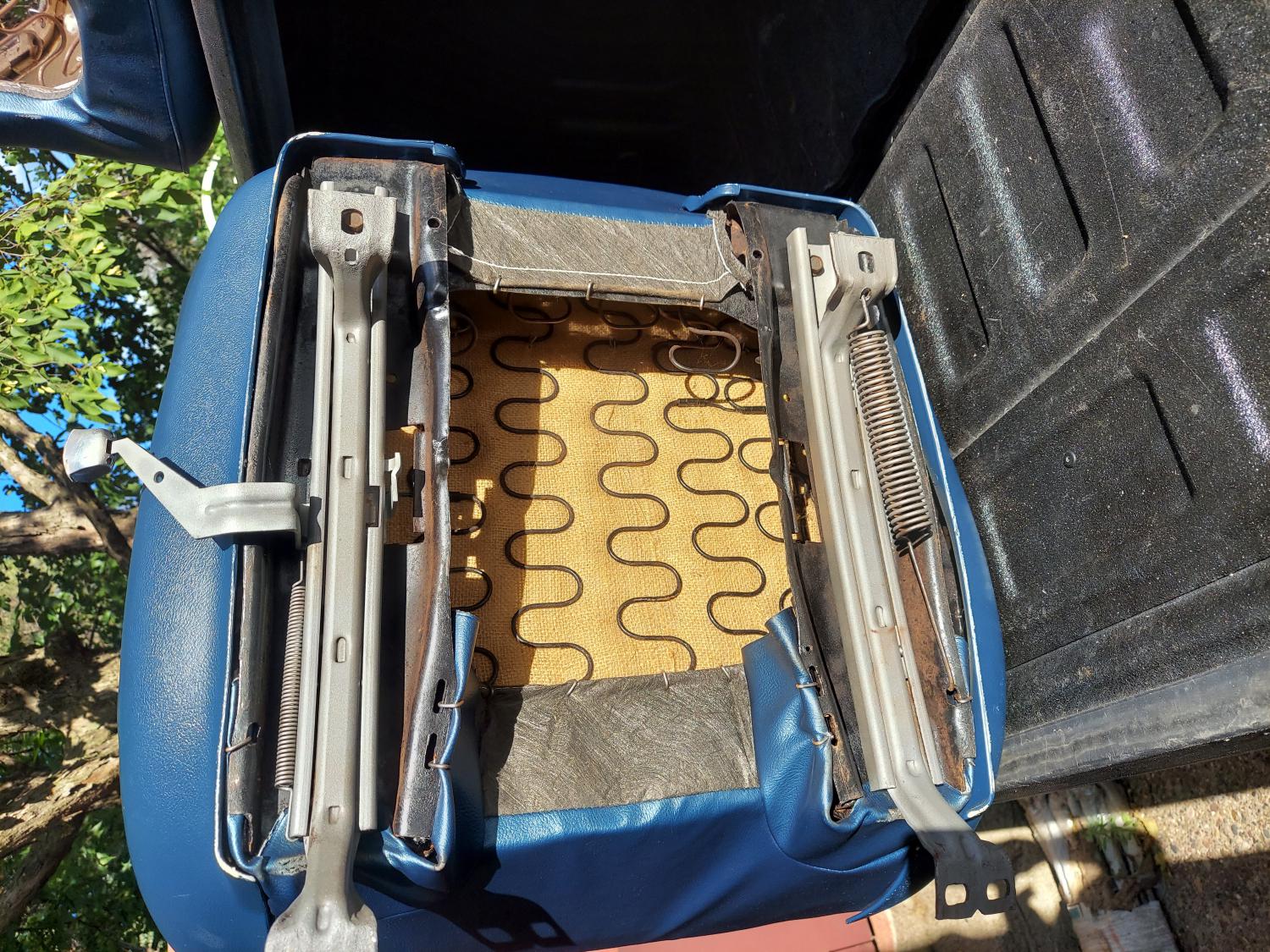 Restored set of bucket seats with all new foam medium blue covers headrest and back releases buttons. Plastic covers repainted with new chrome trim. Frames and springs are perfect. The driver side lower plastic cover does have wear marks painted over. Original headrest are very nice no cracks. Power track also restored blasted cleaned then clear coated and lubed. Cables and transmission also cleaned and re-lubed. New headrest release buttons and back releases. Missing only the belt cover. $2000.00 for the buckets $1,200.00 for the power track. Never installed since restored, Bolt in and done.
