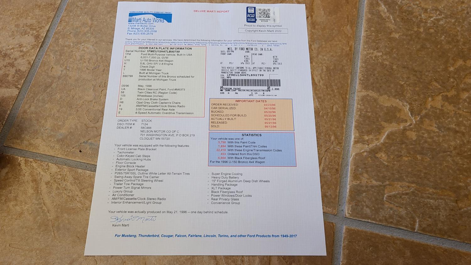 I recently listed a 1 owner, 1996 Bronco XLT Sport 4X4 with just 20,012 original miles for sale and thought Yenko might be a good place to share a survivor like this. If anyone here has interest, or knows someone who may have interest, please don't hesitate to reach out. 350+ photos and 11 HD videos can be seen here: https://www.ebay.com/itm/20415967304...mis&media=COPY Just 1,897 Black XLT Sports were made for the '96 model year. This one is WELL optioned (check out that window sticker price!) with a 351, automatic transmission, XLT trim, Sport Package (includes the ridiculously rare exterior signal mirrors), and on an on... The paper trail is fantastic on this one, too. We have all the original sales documents, dealer goodies offered with Broncos at that time, original DMV processed title, Marti Report, etc. It's all there... All the options work, and the AC blows ice cold. This Bronco is located in Mazomanie, WI 53560, and we're asking $59,900 for "Black Beauty", as she was affectionately named by her original owner. Thanks, SYC. Jeff Last edited by Tidmack; 11-21-2022 at 01:27 AM. |