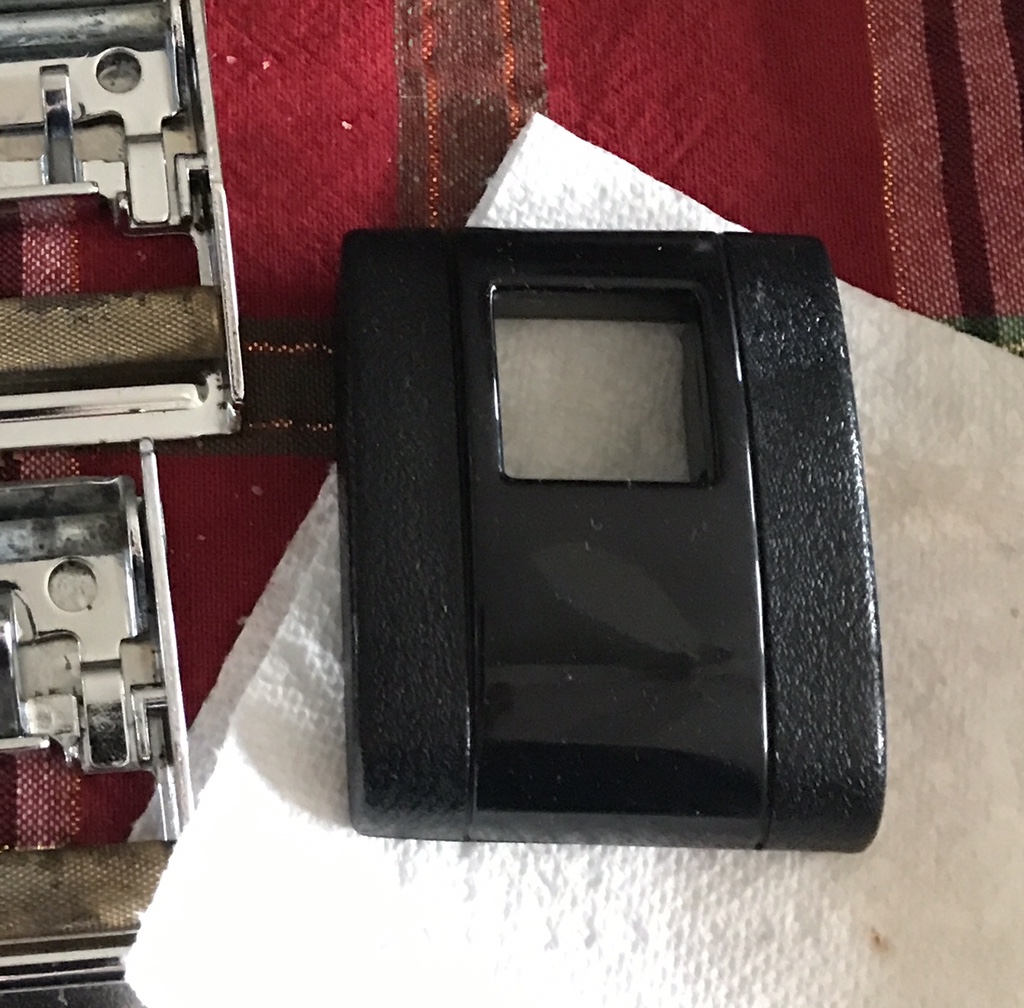 Looking for a very nice to excellent black plastic standard seat belt buckle cover. Used on many GM cars. Possibly also on 67's. No gouges or cracks but light scratches ok as they can be sanded and polished out. The repops are no-go as they have molded sink marks and the texture is barely there. These can be unsnapped easily from the metal buckle using a couple of butter knives.