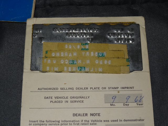 So of course I began to get intrigued. I wanted to see if I could get a picture of the transmission VIN since the car was on jack stands. He said I wouldn't go under there, those are the harbor freight recall jack stands that could come crashing down any time. Car has been on those stands for years. So I decided to try to purchase the car without seeing the trans or rear axle numbers. I asked what he wanted for it and he said do you think I could get 30K or 35K for it. I said maybe, but I can’t go that high. He knew I wanted it and he wanted me to have it. So I brought the maximum amount I could spend on the car in cash. Hidden in our new Suburban. Long story short, he accepted the exact amount I brought with me. It was late at night, I think 3am, so the next afternoon I went to pick up the trailer. BUT WAIT... All the restaurants were closed and no food in the hotel. I ate an entire bag of Pistachios the night before for dinner. I began to have Gout pain in my left ankle. Slowly coming on, and I had no medication with me. I later found out I had cherry pills, but didn't see them until I got home. His friend was nice enough to move all the items blocking the car, air the tires, and start to push it out a couple three feet. We pushed it up with his friends van and a tire carefully. I used a come-along for the last foot and strapped it off. Put the front and rear safety chains on. And a big ratchet strap in the back and threw the slack in the trunk. We did the money transfer. And he said his friend had the paper work in his safe a few miles down the road. The guy showed up and handed me the Plastic Bag, Owner Manual, Owner Protection Warranty Booklet with the original owner Protect-O-Plate inside. This was the original with the plastic tape attached. I didn’t even ask about that stuff. But no title. He never got the car in his name the last 30 or more years. I thought, oh crap, I am buying a car with an open title in another state thousands of miles away. The pain was beginning to really come on from the gout. So I said forget it, I’ll worry about it later and got on the road. All the while knowing legally the guy he bought the car from years ago, STILL owns MY new car. I paid 3 people at gas stations to put gas in my car for the ride home. Stopped at a rest stop exhausted and some how was able to sleep 4 hours. Got back on the road, I had 987 miles to go. But I made it home. I parked the car and trailer in my neighbors drive way. My girlfriend brought me out crutches and I hobbled in the house. Took a lot of medication and 3 days to be able to walk. I had the trailer for 7 days total. So I had to get the trailer back. When I went to my neighbors, someone had tried to steal the car. I don't know how they were going to get it off the trailer and around. But maybe break into my neighbors and bring it into his garage and around the trailer and Suburban. There WAS room to do that. They took off the 2 front straps and safety chain, my back strap, but not the safety chain. Turns out I had 3 guys push down on the car to get it on the next link. So they could not get it off, as it was SUPER tight. Maybe there was only 2 crooks and they couldn’t push it down? Of course all I did was lower the tire pressure half way and popped the chain right off. Ran an air hose over and aired them right back up. Backed it in my driveway and my friend helped me push it off onto my 4 post lift. Took the trailer back and went back home. I told my girlfriend, I have to know. She said what, the other numbers? I said yes. I was still limping and sore. But I raised it up and took some pictures. And it looks like everything matches. Long story short. It took 46 days, but I got the title and proceeded to title it in our name.