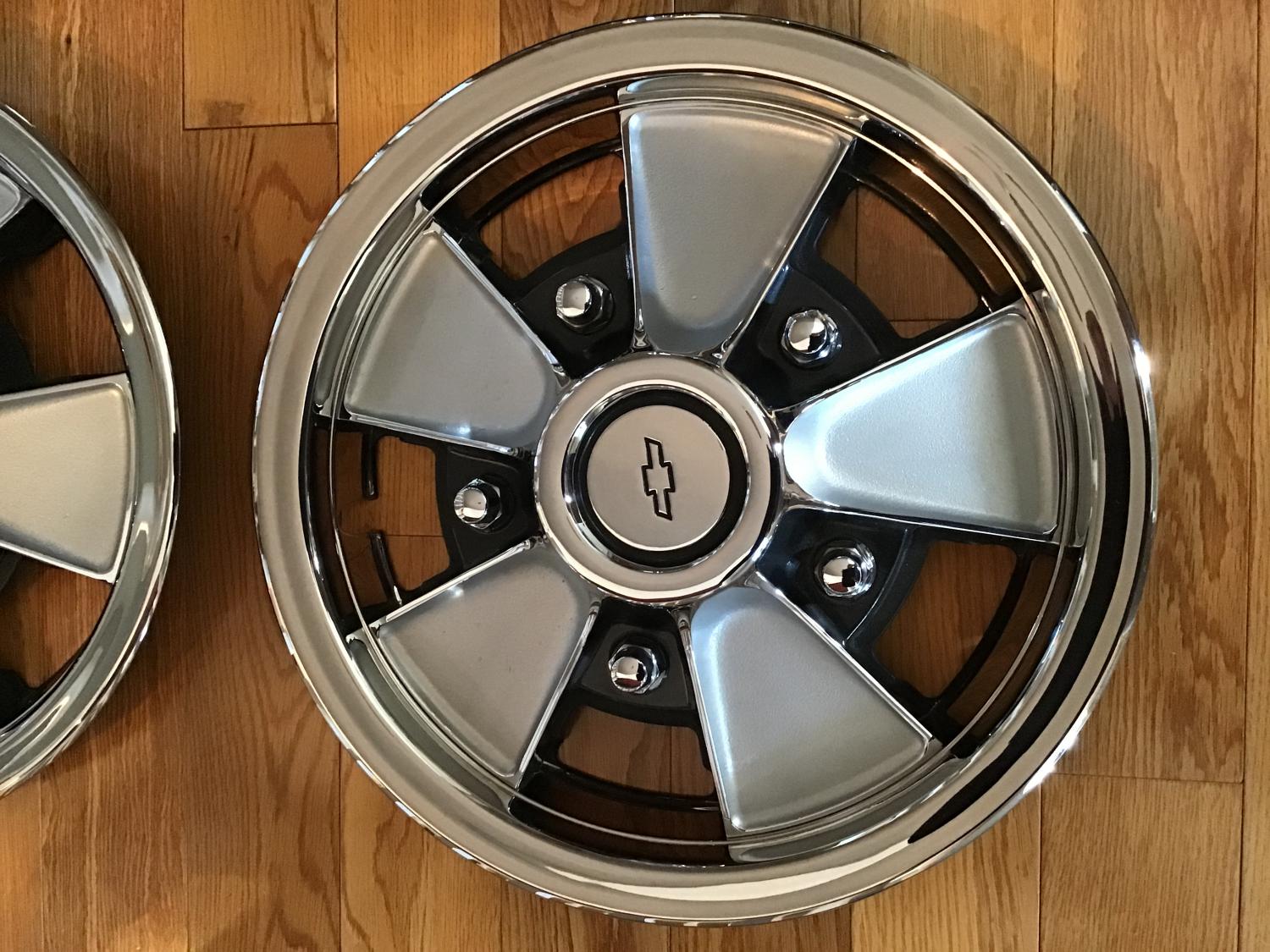 This is a full set of 14” simulated mag wheel covers. These are not NOS but I feel are one of the nicest sets I have ever seen. These are for sure fit for the best of show cars. No dents, road rash or pitting whatsoever. The part number on the back is 552205 and according to the date clock were made in 1969. I have seen so many opinions on correct application that you can make that decision. I was told these were used sparingly since new and taken off when the car was driven regularly. The chrome plating is beautiful. If you have questions let me know. $1600.00 Thanks