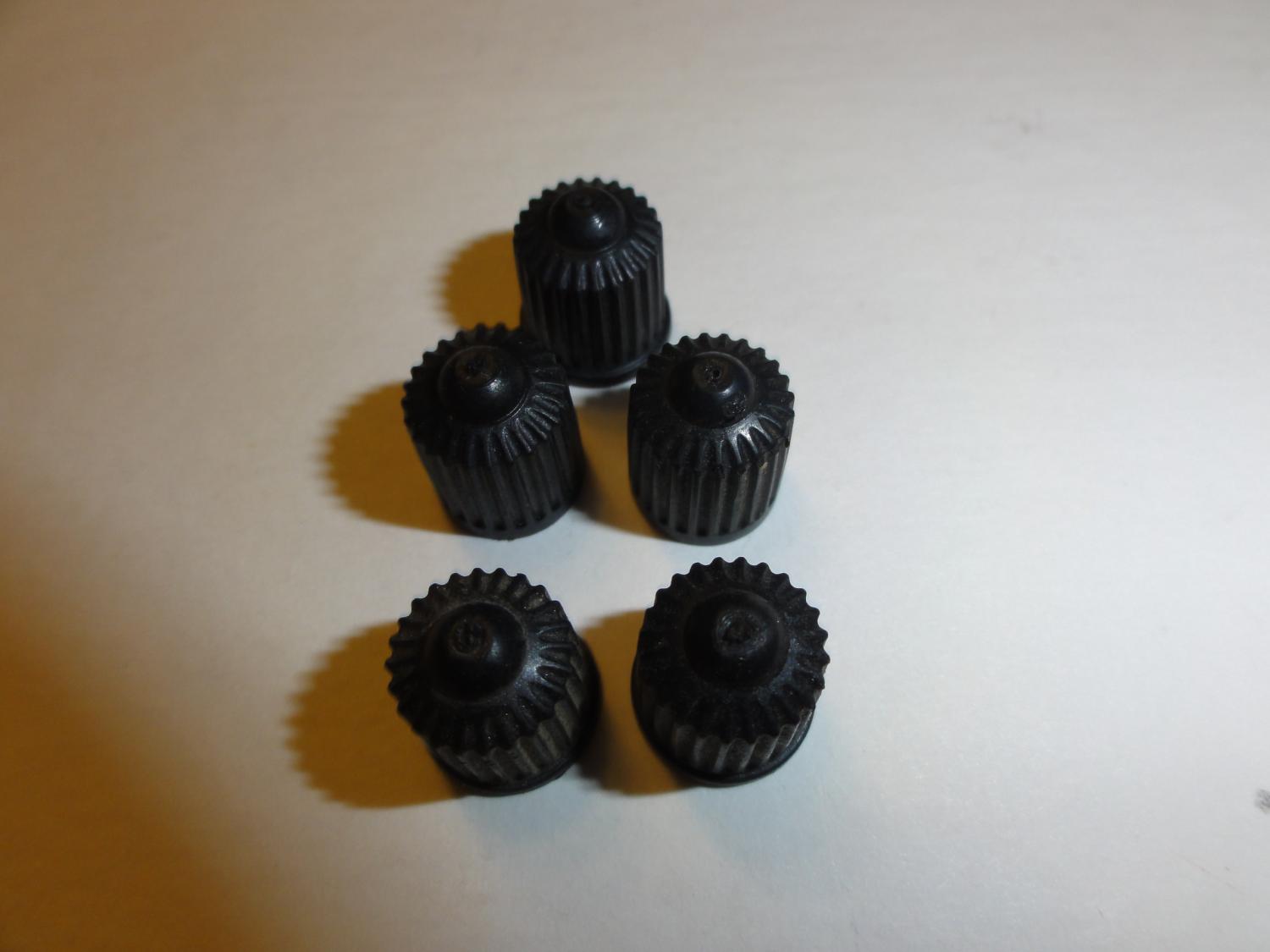 5 Schrader assembly line valve stem caps, ribbed knub top style . Found in an old closed down wheel alignment shop. Excellent condition .Multiple sets available ( 360.00 Free shipping lower 48 states).