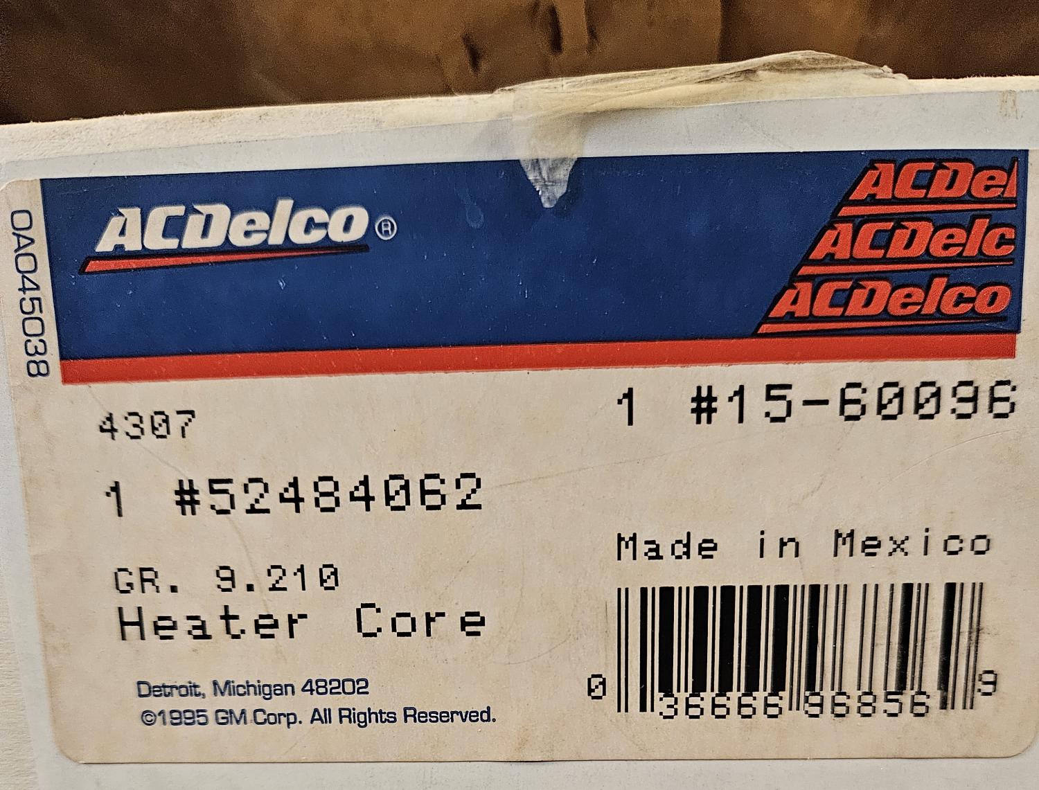 Hey guys, I'm in the process of switching out my heater core. I've done one many years ago and the current one started leaking a few years ago as well. Just my luck, right? Anyway, I had bought a new core a few years ago thinking I would replace it some day. That day has finally come! When I test fit the core it looks like the tubes are closer together than the one I've taken out? It's only about 1/8" but the clamp that holds it in the box might have to be "adjusted" to make it work. All the dimensions look to be right but I thought I'd ask if someone could decode the part number to make absolutely sure it's the right core. And, yeah, it's an older core but at least it's not made in China!!