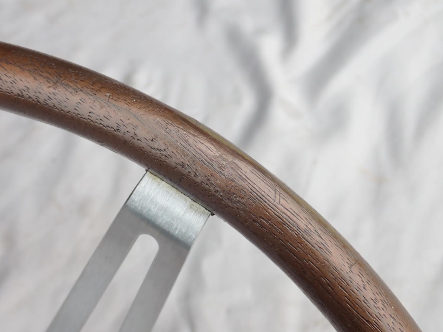 This wheel is in excellent original condition as shown. It may very well be New Old Stock with light shelf wear. The simulated woodgrain has awesome grain texture, vibrant coloring, and no cracks. There are some light scuffs and scratches from the wheel being moved around but surely nothing to write home about. The stainless spokes are also excellent. This wheel would be right at home on the nicest of cars.
