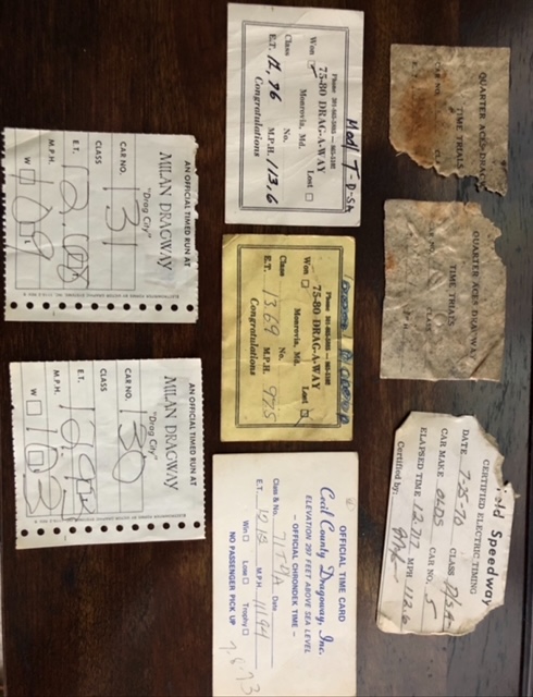 The paint on the passenger window says 12.8 seconds, and the best time slip that I can read is 12.13. But most are mid to high 12's.