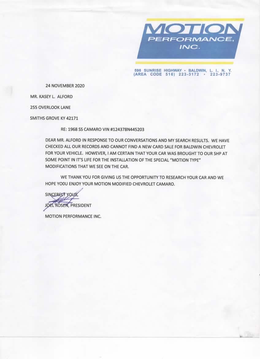 Open letter to Kasey Alford who now owns MP. I have the letter you received from Joel Rosen about the Camaro you owned which I now own. In the attached letter from Joel Rosen he states he is certain this car went through his shop for modifications. Would you be kind enough to advise exactly what Joel saw that would allow him to send you this letter of confirmation? I am trying to determine the past history and was hoping you could shed some light as to it's lineage. I realize it is not a true BM car but the fact that Yenko was the delivering dealer and then went to MP where they did some very clear modifications is a story in it's own rights. It also appears that Yenko installed the motor as the L-72 Casting date, cowl tag and motor completion date (stamp under starter) show everything is within 3 weeks of one another. I am curious to receive your comments.