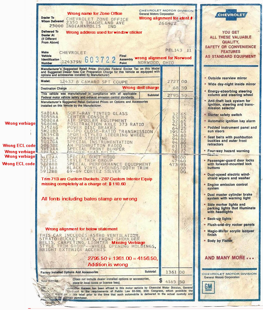 There has been many threads and comments regarding this 1969 Camaro VIN: 124379N603722. There have been plenty of posts on Team Camaro and CRG also commenting on plenty of issues with this car. The MacNeish report authenticating the car also has plenty of comments regarding this same car. Fake window sticker and POP. Engine block decked and re-stamped, replacement 4-spd trans re-stamped and casting number removed, etc, etc. Here's and analysis of the window sticker as information. Much more to reproducing a window sticker correctly than just aging it......