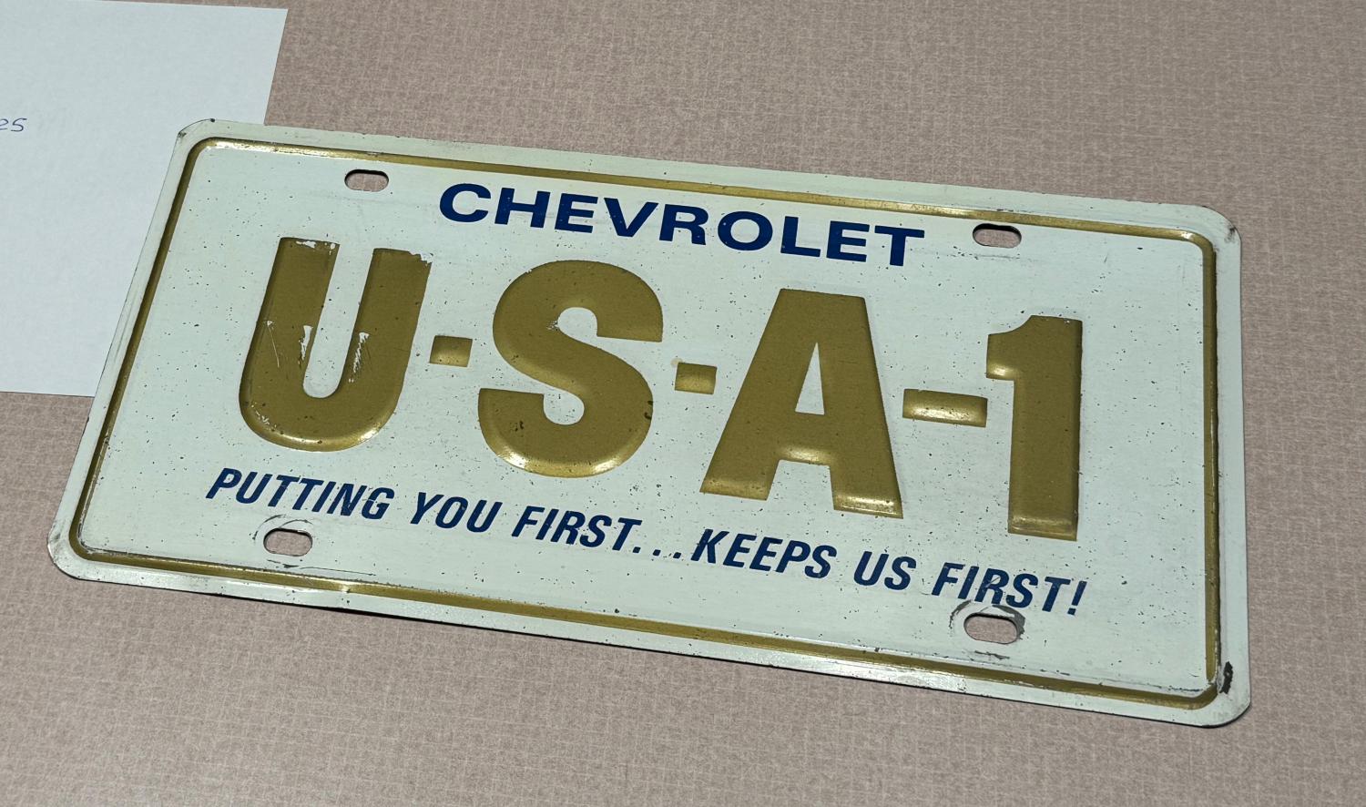 1969-70 Chevrolet Dealership Plate USA-1 "Putting You First...Keeps Us First" Used condition with some paint wear. Still has good colors, and is a nice straight heavy steel plate. Asking $450 including shipping.
