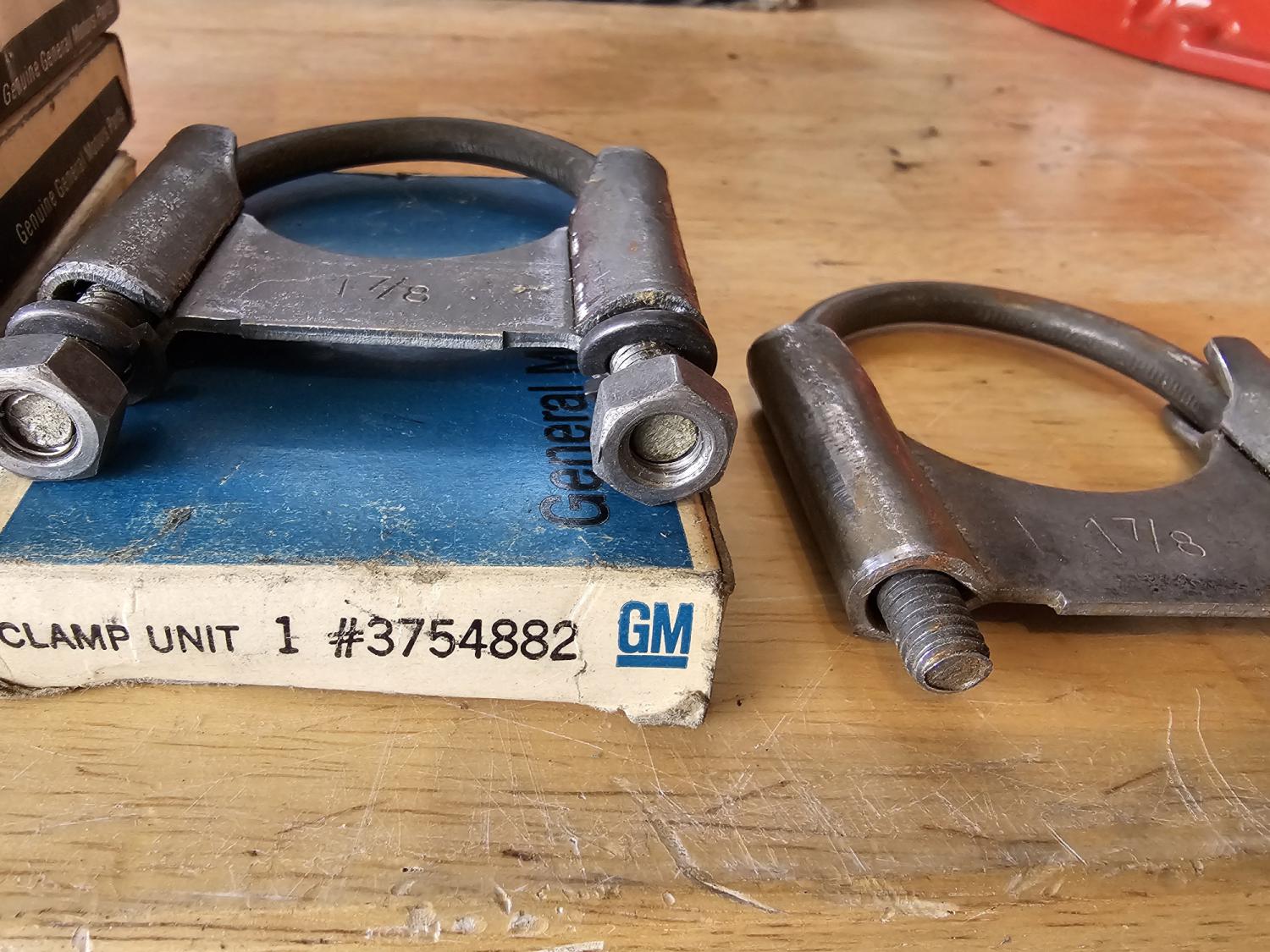 10 NOS Exhaust muffler clamps, used on 1965-1970 Chevelle Camaro Nova GTO and many other GM cars. $125.00 usd plus shipping.