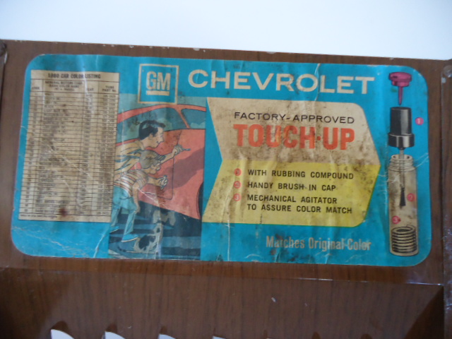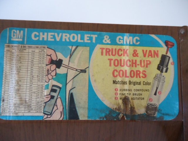Two 1980 GM Metal Factory Approved Touch-Up Paint Display counter racks.One is CHEVROLET CARS,the other CHEVROLET & GMC TRUCK & VAN.One is holding 5 paint sticks.Both show their respective paint code charts.Can be hung on a wall too.
