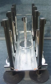 These stanchions are made by Tensabarrier. There is a set of 8 that are a black wrinkle finish with a black and yellow tape that extends up to 13 ft.. The measurements or the posts are 40” tall, 13 ½” wide at the base, and the pole is 2” in diameter. There is also a set of 6 gallery stanchions that are a polished chrome finish with a solid black tape that extends to 7ft. The measurements are 25” tall, 11 ½” wide at the base, and the pole is 2” in diameter. Included with this package is a cart for storage and transportation. The cart fits stanchions that measure up to 14” at the base and 2 ¾” posts. It can fit up to 18 at one time. It is equipped with padded surfaces to keep your stanchions from moving around or being scratched. It also has a rubber strap to keep the stanchions in place. It is made with 6” industrial rubber wheels, gray painted steel handle and chassis and has a heavy galvanized steel deck. The cart measures 30”w x 60”l x 17” h (it is 57” h when loaded). When purchased new these items cost over $3000. The price for the package is $1800.00. Please email me at