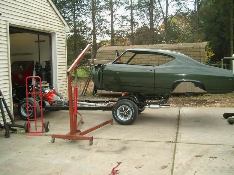 Today I witnessed (helped briefly) the body going back on the frame. It looks as good in person as it does in the pictures. The body is straight. Paint is excellent. Engine and chassis detail is also top notch. This will be a real head turner this summer at the shows.