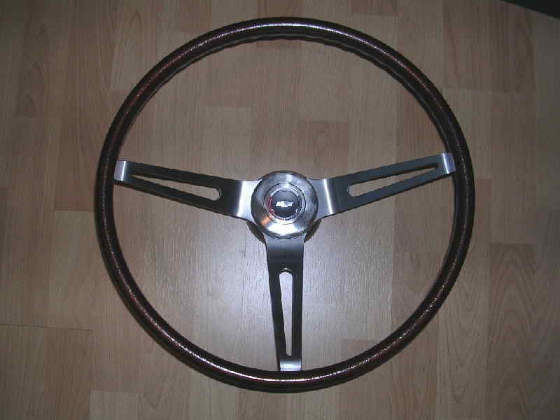bought recently from Bill, this is a orig restored '67/8 Walnut wheel nice clean wheel, horn button came loose in shipping and got a little nick, I hit it with 1000 wet dry trying to save it and it had a phony clear coat over the alum, anyway the button looks ok for a driver, I would toss it and get a new one , $375.00 email for pics. Thnx Bud. |