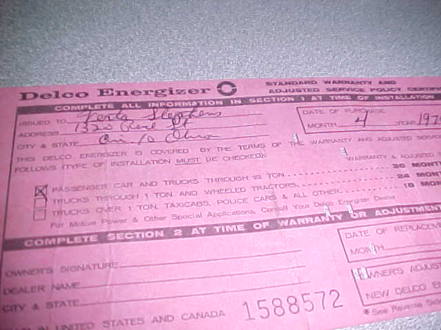 Also received this R59 warranty card. In 4/70 battery was replaced,probably due to the fact it sat at the dealership for around 6 months before selling. I assume it was hard to sell a $4700.00 camaro with no radio, so a radio was added and the car discounted to $4000..