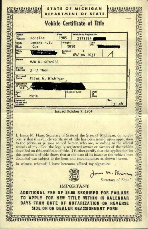 Dad had made a little display for me of the '65 GTO: a framed felt background with a couple photos, a new unused set of original keys, a time slip from Lapeer (International! Dragway), repop window sticker, and the original title. I was looking at the display and noticed the license plate on the title: HW-1031. I thought "geez, that plate looks familiar". Sure enough, I dug out the photo of the '64 and - same plate. Dad had transferred the plate off the '64 and it became the original plate for the '65. Note - back then plates were due on Jan 1st of every year. That meant every person in the state had to renew their plate prior to the same day. In a shocking display of project management, the Michigan Secretary of State later changed the process so that plates became due on the registrant's birthday, thereby leveling the workload across the whole calendar year, which is how it is still done today. http://i23.photobucket.com/albums/b3...1.jpg~original |
