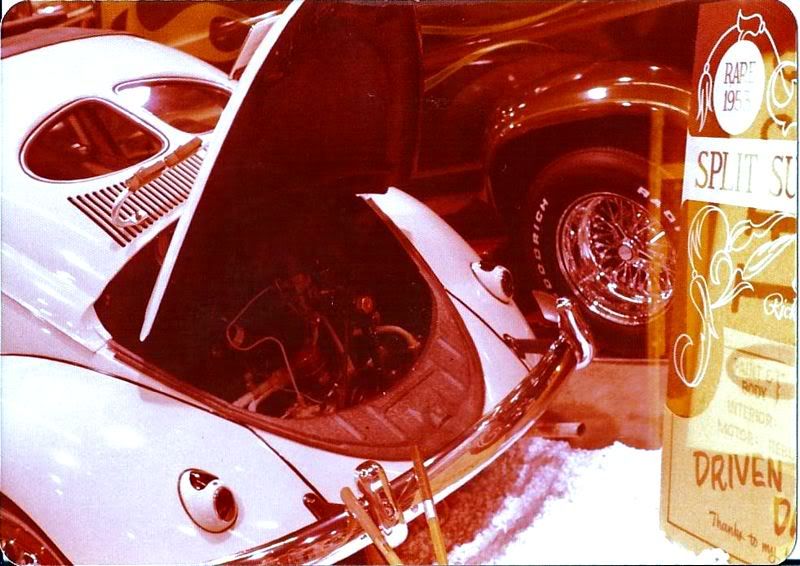 More Anaheim Convention Center...this car was a weird shade of green... http://img.photobucket.com/albums/v6.../tn_ACC781.jpg http://img.photobucket.com/albums/v6.../tn_ACC782.jpg High school buddy Rob's split window bug (I remember he scored the tail lights out of a warehouse in Mexico...LOL). He sold this and built a flip front end 56 ford truck...that ended up in a bunch of magazines, http://img.photobucket.com/albums/v6.../tn_ACC783.jpg This was owned by a local auto shop ...and was used as advertising http://img.photobucket.com/albums/v6.../tn_ACC784.jpg The Van WIlgen VW...actually one of 4. Gene (who did the body work on my Nova and collected BMW Isettas way back then) built a bug for each of his kids when they graduated high school. This one was built start to finish in about 1 month. He added the split window to the back, envelope chopped the roof, made it right hand drive and it won Bug o rama at OCIR. This picture was it's debut to any show. Notice the VW cutouts in the turn signal area...before billet stuff was popular [img]<<GRAEMLIN_URL>>/smile.gif[/img] http://img.photobucket.com/albums/v6.../tn_ACC785.jpg |