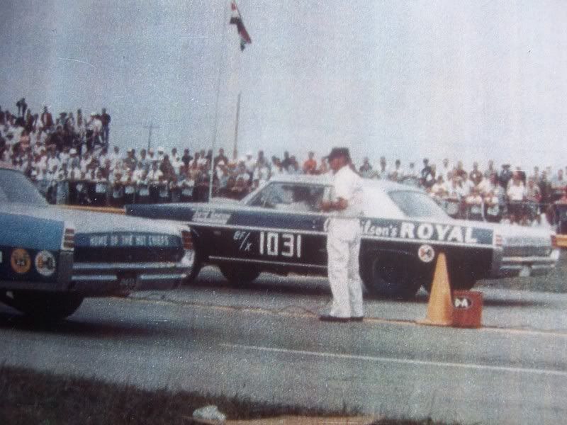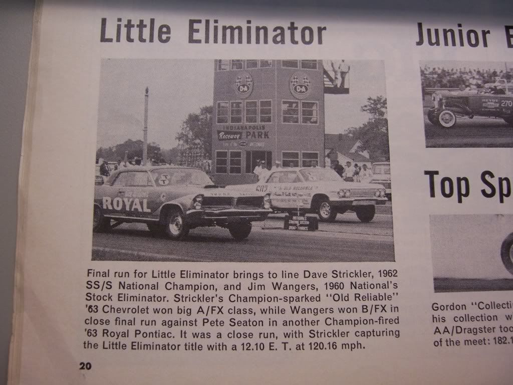 Dad driving Pete Seaton's car (far lane) B/FX Final Round, Indy Nats 1963. Jim Wangers in the Swiss Cheese Cat in the near lane: