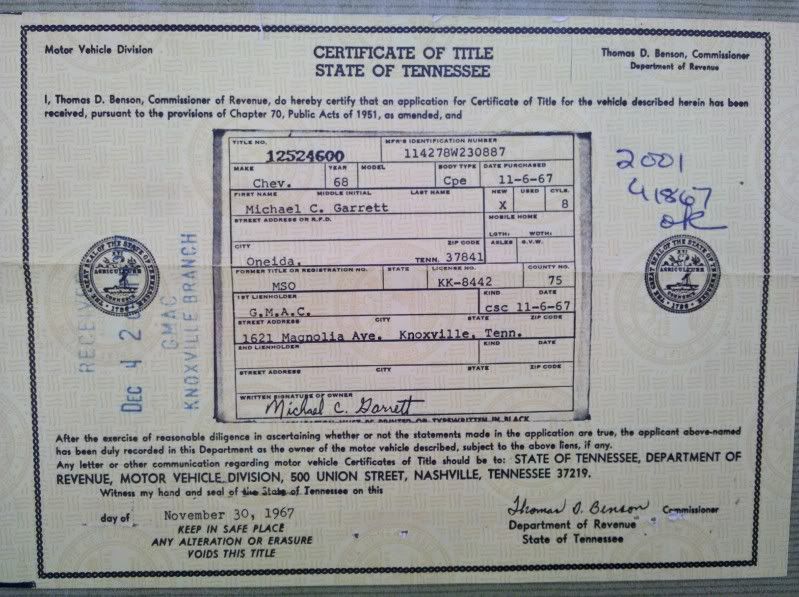 Iam selling my 1968 ss 350 survivor Nova all orginal born with 350 295hp motor,stater,alt,dist,radiator,smog ,M20 trans ,12bolt 331 posi rear all orginal.I have paper work and protecto plate 80% orginal paint and all 5 orginal born with http://i411.photobucket.com/albums/p...805_150912.jpg XF rims have the orginal title in the orginal owners name and still talked to the orginal owner.Have all Maintenance records very nice car for a survivor it has dings and The Lacquer paint has some checking on hood and trunk THIS IS NOT A RESTORED PERFECT CAR .Very rare when have you seen one for sale like this 35k Brent cell#410 320 6867