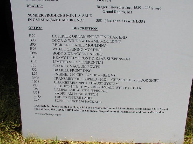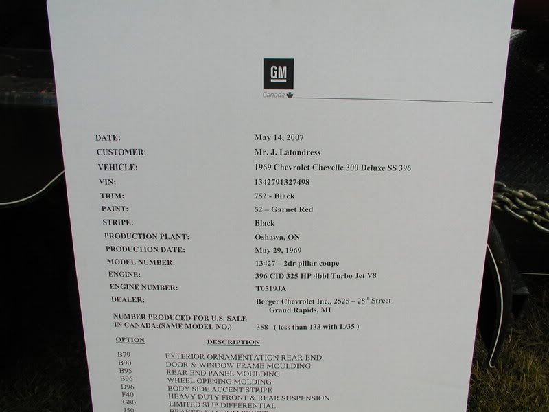 Feel free to read the entire build thread of this rare Chevelle on the Yenko.net website. https://www.yenko.net/ubbthreads/ubbt...s-396-chevelle Sold new at Berger Chevrolet in Grand Rapids, MI. This Chevelle was Meticulously Restored by GS (George Steele) Restorations, in Joelton, TN. There are ONLY a handful of these magnificent SS396 300 Deluxe Post Sedan that exist today, even fewer in Garnet Red. This Chevelle can be viewed at the up coming 2014 AACA Annual Grand National, Southeastern Division National Dual Meet in Lebanon, TN. June 12th, 13th and 14th. Price - <span style="font-weight: bold">$72.5K</span> Please contact me for any additional [email protected] Here is a great story.... as narrated from the original owner. Doug Harrison was 18 years old in the summer of 1969 and decided he wanted to buy a new Camaro. He takes the 20 minute drive to the infamous Berger Chevrolet in Grand Rapids Michigan. While looking at the Camaro’s he spotted a Garnet Red 69 Chevelle SS396 300 Deluxe shining and looking mean! He forgot what he came there for a Camaro and fell in love with the Chevelle and had to have it. They would not sell him the Chevelle and he had to go home and get his Mother to sign for him. Imagine the begging and pleading that was going on! Mom finally caved-in and Doug got his bright new 1969 Garnet Red Chevelle. What Doug didn’t realize.....he purchased a very rare 1 year only Post Sedan SS396 Chevelle, the only year you could get a Super Sport with the 300 Deluxe platform . He did what everybody did back then, he "Day2'd" it. Headers, Cragars, Hijackers, Intake, Carb, etc. There was no numbers matching, correct finish back then. Doug even puts a 4 speed in it.... as it came with a heavy duty 3 speed Muncie for one more gear to spin. It already had Chambered exhaust from the factory, something that GM stopped putting on Chevelles a month or so earlier but it was built in Canada at the Oshawa plant and didn’t have to follow the same rules as the US cars. Doug loved the Chevelle and said he waxed it almost every day! As the family grew....the Chevelle got too small, the gas doubled and was hard to find.... Doug sold the Chevelle in 1973. It exchanged hands a few times until 1987 and was left for dead. With several “I am going to restore it” it stayed not running for 20 years until the current owner purchased it off "Ebay" in 2007. Car was reunited with original owner at the 2013 Berger Chevy Show and he was allowed to drive the Chevelle again just like the summer of 69! http://img.photobucket.com/albums/v6...ps7c2d3404.jpg http://img.photobucket.com/albums/v6...psf9c78a2e.jpg http://img.photobucket.com/albums/v6...ps61ed325f.jpg http://img.photobucket.com/albums/v6...psd52d2927.jpg http://img.photobucket.com/albums/v6...ps75c1ca6e.jpg http://img.photobucket.com/albums/v6...ps71fcae8c.jpg http://img.photobucket.com/albums/v6...ps32c9dcb4.jpg http://img.photobucket.com/albums/v6...psb07397ca.jpg http://img.photobucket.com/albums/v6...ps6c1baaff.jpg http://img.photobucket.com/albums/v6...ps08dfe692.jpg http://i31.photobucket.com/albums/c3...ps2062bd9d.jpg http://i31.photobucket.com/albums/c3...ps4b86cf63.jpg http://i31.photobucket.com/albums/c3...psf9beb5ac.jpg http://i31.photobucket.com/albums/c3...ps72ccc174.jpg http://i31.photobucket.com/albums/c3...ps66f0a210.jpg http://i31.photobucket.com/albums/c3...psc4662e33.jpg http://i31.photobucket.com/albums/c3...ps70faf93b.jpg http://i31.photobucket.com/albums/c3...psb7156469.jpg http://i31.photobucket.com/albums/c3...psd60d8ea0.jpg http://i31.photobucket.com/albums/c3...psce493c8b.jpg Dan |