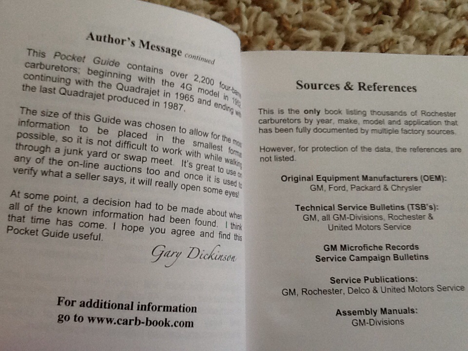 I picked up a pocket Q Jet ID book, great to take to the swaps, if it's all correct that is, it lists thousands. I don't think it lists all, only 4 BBLs too, it does list replacement and Marine carbs. Other than looking up my carb, I haven't checked it. Anyone have this?