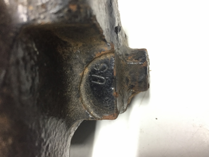 Nice, unpitted and clear US stamp and clear casting numbers and Julian Date 334 with remnants of what could very well be original black paint... surface rust on the rough cast finish. Core, needs rebuild of course.