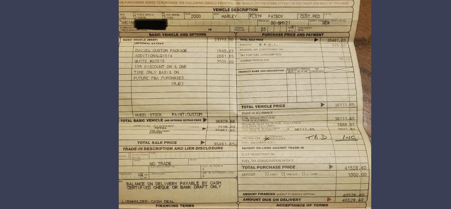 It was purchased new locally in March of 2000. MSRP was $23,733 CDN and the out the door cost was $41,500! It has a factory custom paint set - number 33 of 125 produced with just 5 sets coming to Canada - chrome front end, chrome swing arm, chrome wheels and a custom engraved dash and tank bib that matches the graphics under the Brandy Wine Candy paint. It also got a 95 cubic inch upgrade and a ton of accessories. It left the dealer with 25 kms (15 miles) on it and was parked in the owner’s living room until July of 2019 and never ridden. A local bike guy who new the original owner purchased it and spent $4k recommissioning the bike and adding the current exhaust pipes which compliment the graphics in the paint also. He added another 168 kms and sold it to me. I’m probably going to take some of the accessories off to tone it down a little, but otherwise I love it!