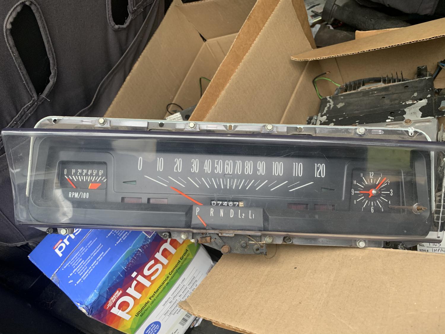 Up for sale is an excellent example of a tach dash for a small block SS Nova. The mileage shows 7400 and the condition of the unit backs that up. The color is fantastic. Any questions feel free to ask.