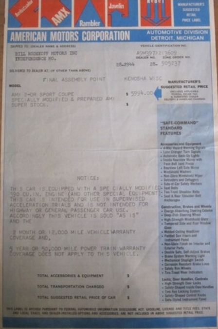 In 1968 Plymouth produced factory built Super Stock Darts & Barracudas, Ford introduced a lightweight 428 Cobra Jet Mustang to ultimately compete in the Super Stock class. Not to be outdone in 69 AMC introduced their own Super Stock AMX. These were the ultimate purpose built factory built race prepared cars of their day.