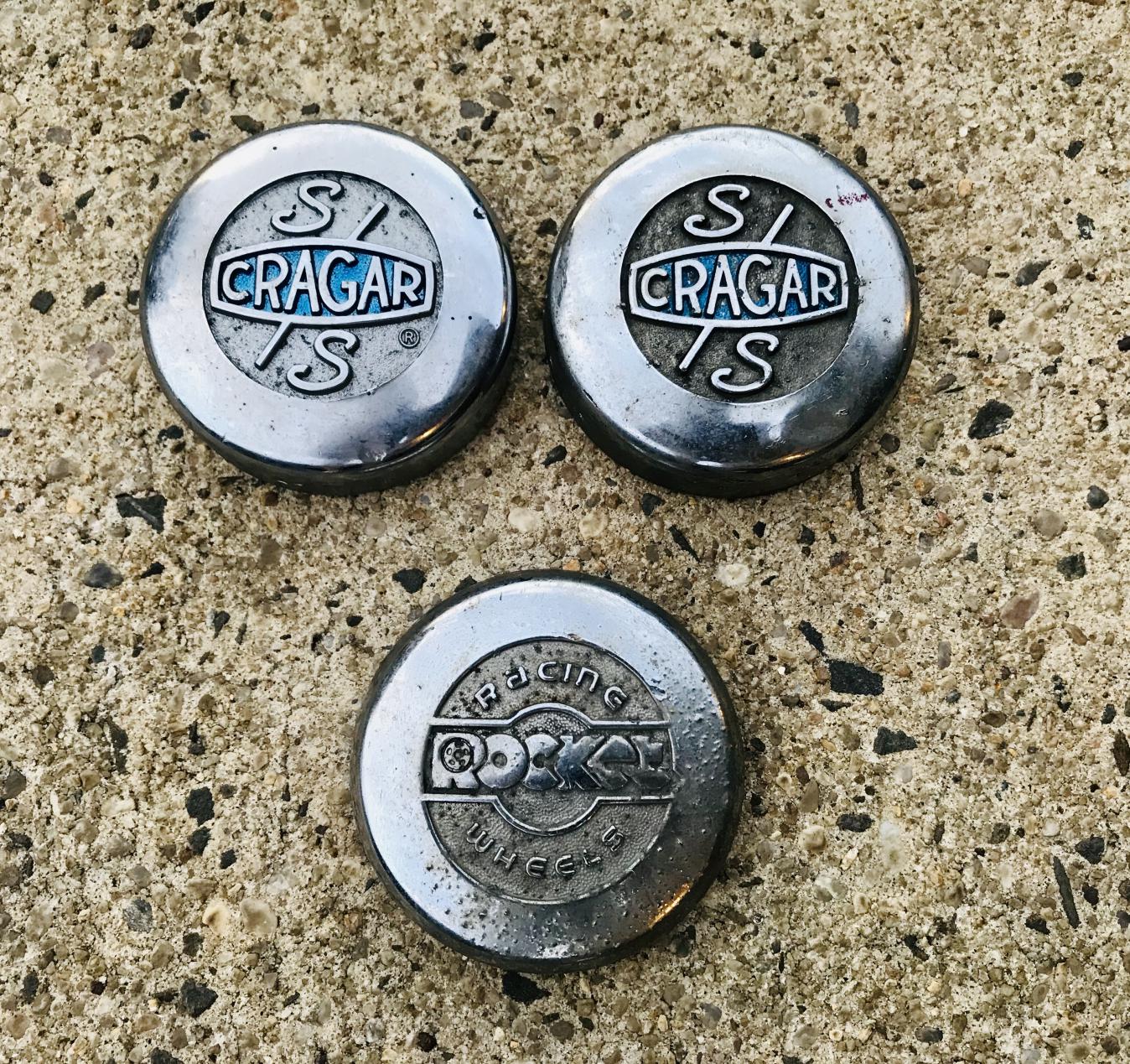The cragar caps may clean up with some elbow grease, one of them is a non-R. The rocket cap needs to be rechromed but is worth saving. (SOLD)
