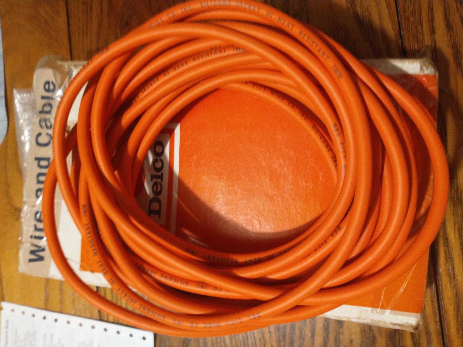 New Old Stock Vintage DEL CITY Performance Hi Temp 7 mm Silicone Solid Core Stainless steel Ignition wire bulk of 28 ft. Enough for any Engine. These are GM Vendor supplied by Del City. Equivalent to Packard /Delco SS550 ORANGE Wires.Super