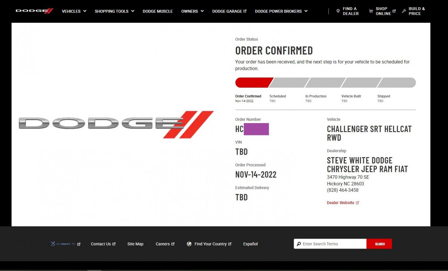 02/17/2022 order date Vehicle Order Number (VON) received from Koons Dodge in Tysons Corner, VA