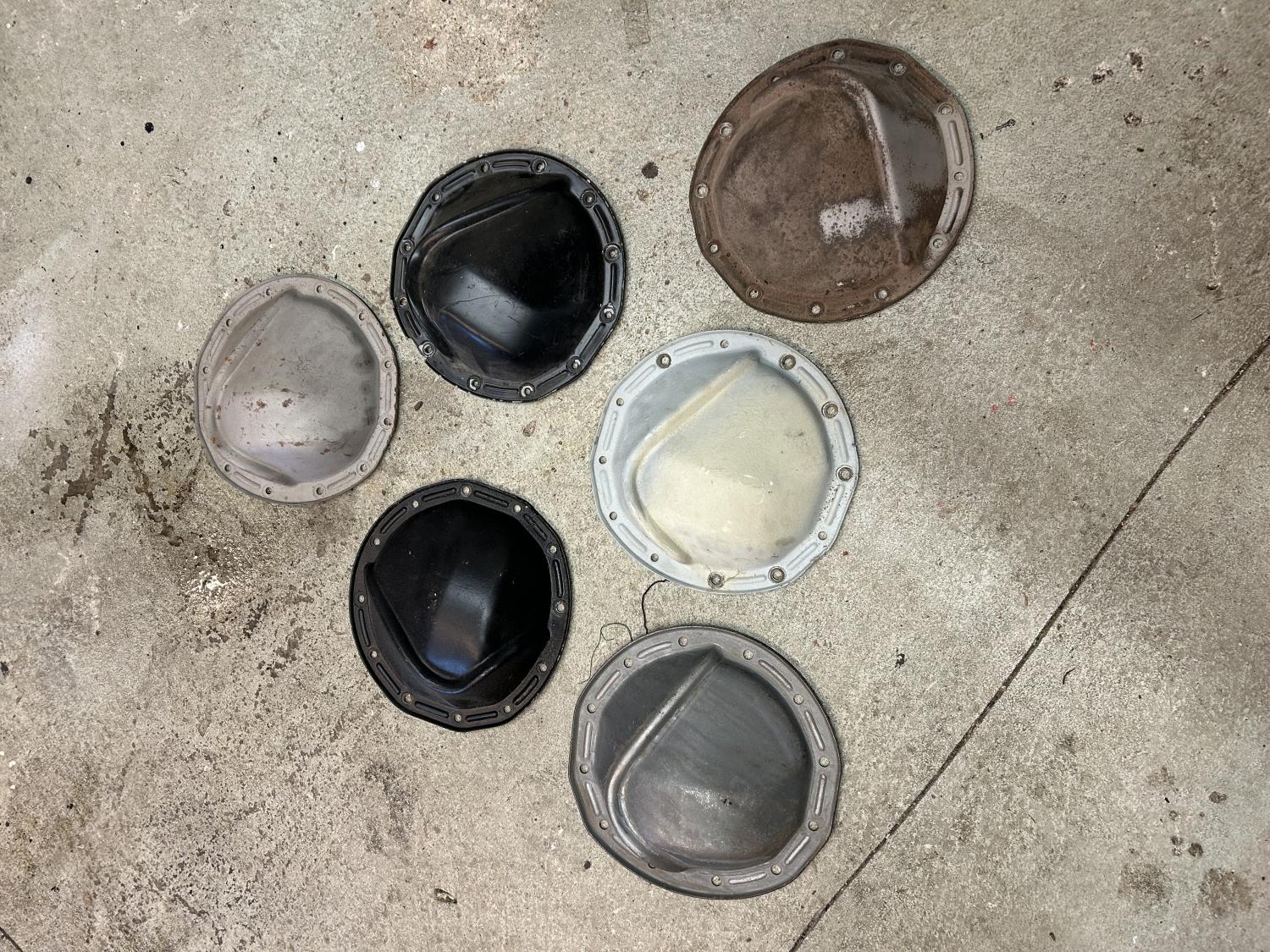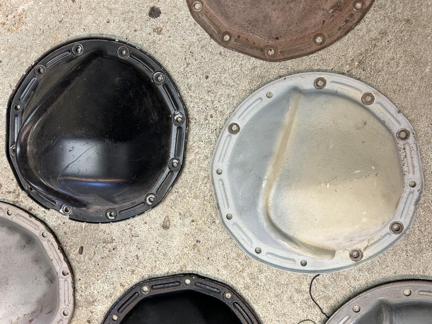 Have a bunch of Chevy 12 bolt covers that I have had laying around forever, may be some tiny pry marks on them 1 is notched the rest are not. There may be a repro in here (lower left), not sure if anybody knows how to check for that, let me know. If your interested in a particular cover, I will blast it clean for you. $75 each