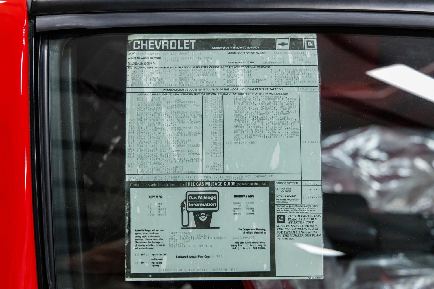 The exterior of this 1987 Chevrolet Camaro IROC-Z with 87 original miles is truly remarkable because it presents as new. It's the best overall example of any vehicle from the 1980's that's ever been offered from the MS CLASSIC CARS Collection. The entire car appears as if it were stored in a bubble for the last 37 years. The factory original Bright Red paint was tested with an electronic paint meter by MS CLASSIC CARS and passed as 100% original. The paint is virtually flawless and was recently detailed to a show quality finish by the team at MS CLASSIC CARS. All of the factory original stamped glass is in excellent condition throughout. It retains the 3 factory original assembly tags on the front windshield. It retains the factory original plastic door guard protectors that were installed to prevent damage in transportation. It retains the factory original white stickers on all four 16” alloy wheels. It retains the factory original green stickers on all four Goodyear Eagle VR50 P245/50/VR16 (Gatorback) tires. The car also retains the factory original optional power antenna, glass roof panels, black door edge guards and rear window louvers. All of rubber seals and gaskets are soft and free of cracking.