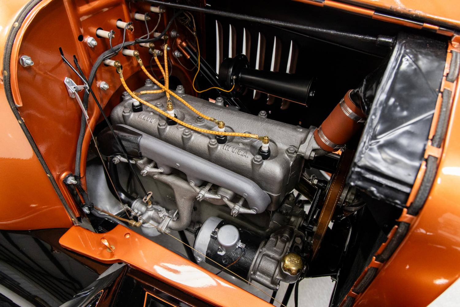 The inviting interior is entered through the passenger side. The entire dash and steering column were painted Cooper with some Black appointments. The dash houses the Ford Amperes gauge. The chrome 4-spoke steering wheel has a wooden rim. The inner door panels and bench style was upholstered in Black leather which is soft to the touch. The Black wooden floor boards and three Black pedals are in excellent condition. The engine compartment is highly detailed throughout. From the information gathered it's believed to have its factory original 177ci Inline 4-clyinder engine based on the year of the vehicle and engine stamp number. This engine was factory rated with 20hp with a top speed of 42 mph. The engine is coupled to a 2-speed planetary transmission.